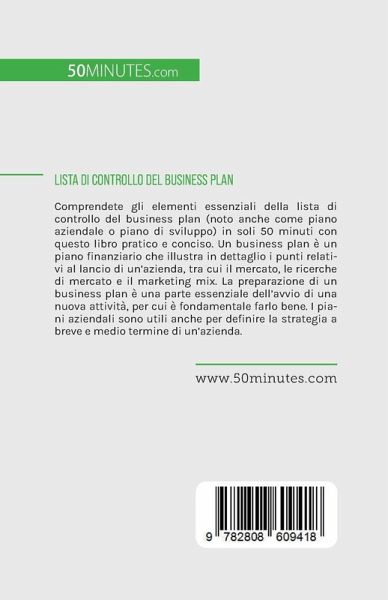 Comprendete gli elementi essenziali della lista di controllo del business plan (noto anche come piano aziendale o piano di sviluppo) in soli 50 minuti con questo libro pratico e conciso. Un business plan è un piano finanziario che illustra in dettaglio i punti relativi al lancio di un'azienda, tra cui il mercato, le ricerche di mercato e il marketing mix. La preparazione di un business plan è una parte essenziale dell'avvio di una nuova attività, per cui è fondamentale farlo bene. I piani aziendali sono utili anche per definire la strategia a breve e medio termine di un'azienda. Questo libro fornisce una pratica introduzione ai business plan e consente di determinare la fattibilità di una particolare idea. Imparerete non solo a redigere un piano utilizzando tecniche come l'analisi PESTLE e SWOT, ma anche a studiare esempi pratici, a capire quali sono le carenze dello strumento, in particolare il fatto che si tratta solo di una previsione, e sarete introdotti a modelli correlati, come il diagramma di Gantt.