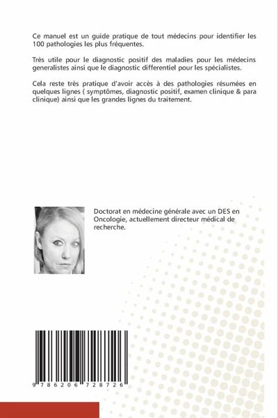 Ce manuel est un guide pratique de tout médecins pour identifier les 100 pathologies les plus fréquentes.Très utile pour le diagnostic positif des maladies pour les médecins generalistes ainsi que le diagnostic differentiel pour les spécialistes.Cela reste très pratique d'avoir accès à des pathologies résumées en quelques lignes ( symptômes, diagnostic positif, examen clinique & para clinique) ainsi que les grandes lignes du traitement.