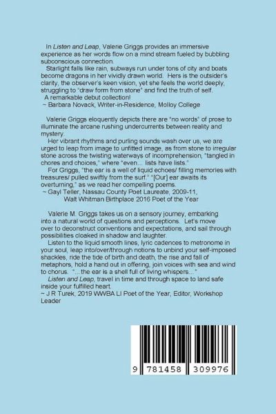In Listen and Leap, Valerie Griggs provides an immersive experience as her words flow on a mind stream fueled by bubbling subconscious connection. Starlight falls like rain, subways run under tons of city and boats become dragons in her vividly drawn world. Hers is the outsider's clarity, the observer's keen vision, yet she feels the world deeply, struggling to "draw form from stone" and find the truth of self. A remarkable debut collection!