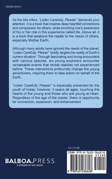 As the title infers, "Listen Carefully, Please!" demands your attention. It is a book that inspires deep heartfelt connections and compassion for others, while enriching one's awareness of his or her role in this experience called life. Above all, it is a book that awakens the reader to the needs of others, especially Mother Earth. Although many adults have ignored the needs of the planet, "Listen Carefully, Please!" boldly targets the reality of Earth's current situation. Through fascinating and loving encounters with various species, six young explorers encounter remarkable events that reveal realities not experienced before. These interactions profoundly change the young adventurers, inspiring them to take action on behalf of the Earth. "Listen Carefully, Please!" is especially presented for the youth of today; however, it spans all ages, touching the hearts of the young and those who are young at heart. Regardless of the age of the reader, there is opportunity for connection, expansion, and enhancement.