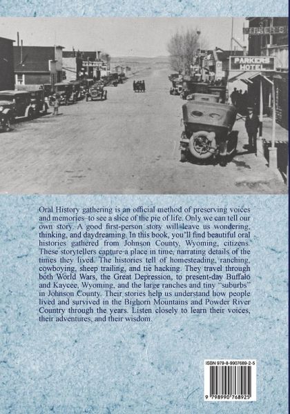 Oral History gathering is an official method of preserving voices and memories-to see a slice of the pie of life. Only we can tell our own story. A good first-person story will leave us wondering, thinking, and daydreaming. In this book, you'll find beautiful oral histories gathered from Johnson County, Wyoming citizens. These storytellers capture a place in time, narrating details of the way they lived their lives. The histories tell of times along the Bozeman Trail, homesteading, cowboy days, and sheep trailing. They travel through both World Wars, the Great Depression, and on to present-day Buffalo, Kaycee, and the tiny "suburbs" and large ranches in Johnson County. Their stories help us understand how people lived and survived in the Bighorn Mountains and Powder River Country through the years. Listen closely to hear their voices, their adventures, and their wisdom.