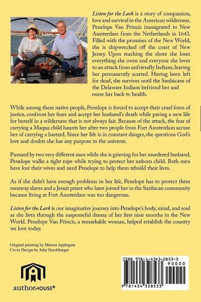 Listen for the Lark is a story of compassion, love and survival in the American wilderness. Penelope Van Princis immigrated to New Amsterdam from the Netherlands in 1643. Filled with the promises of the New World, she is shipwrecked off the coast of New Jersey. Upon reaching the shore she looses everything she owns and everyone she loves to an attack from unfriendly Indians, leaving her permanently scared. Having been left for dead, she survives until the Sanhicans of the Delaware Indians befriend her and nurse her back to health. While among these native people, Penelope is forced to accept their cruel form of justice, confront her fears and accept her husband's death while paving a new life for herself in a wilderness that is not always fair. Because of the attack, the fear of carrying a Maqua child haunts her after two people from Fort Amsterdam accuse her of carrying a bastard. Since her life is in constant danger, she questions God's love and doubts she has any purpose in the universe. Pursued by two very different men while she is grieving for her murdered husband, Penelope walks a tight rope while trying to protect her unborn child. Both men have lost their wives and need Penelope to help them rebuild their lives. As if she didn't have enough problems in her life, Penelope has to protect three runaway slaves and a Jesuit priest who have joined her in the Sanhican community because living at Fort Amsterdam was too dangerous. Listen for the Lark is our imaginative journey into Penelope's body, mind, and soul as she lives through the suspenseful drama of her first nine months in the New World. Penelope Van Princis, a remarkable woman, helped establish the country we love today.