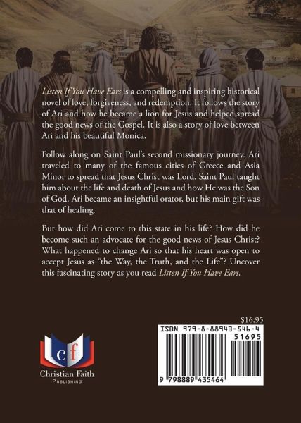 Listen If You Have Ears is a compelling and inspiring historical novel of love, forgiveness, and redemption. It follows the story of Ari and how he became a lion for Jesus and helped spread the good news of the Gospel. It is also a story of love between Ari and his beautiful Monica. Follow along on Saint Paul's second missionary journey. Ari traveled to many of the famous cities of Greece and Asia Minor to spread that Jesus Christ was Lord. Saint Paul taught him about the life and death of Jesus and how He was the Son of God. Ari became an insightful oratory, but his main gift was that of healing. But how did Ari come to this state in his life? How did he become such an advocate for the good news of Jesus Christ? What happened to change Ari so that his heart was open to accept Jesus as "the Way, the Truth, and the Life"? Uncover this fascinating story as you read Listen If You Have Ears.