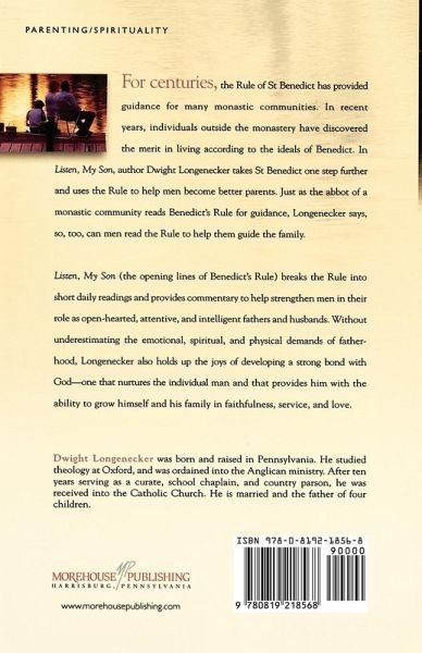 Listen, My Son (the opening words of Benedict's Rule) breaks the Rule into small daily portions and provides commentary specifically geared to help men be better husbands and parents. Without underestimating the emotional, spiritual, and physical demands of fatherhood, Longenecker also holds up the joys of developing a strong bond with God -- one that nurtures the individual man, and that provides him with the ability to grow himself and his family in faithfulness, service, and love.
