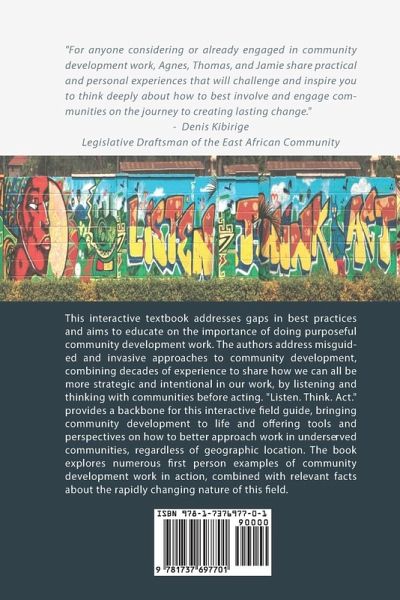 This is a book about community development and how to do it better! It is a book for anyone interested in doing good community development work. This interactive textbook addresses gaps in best practices and aims to educate students, researchers, organizational leaders, and others on the importance of doing purposeful community development work. The authors, three nonprofit and academic leaders from Uganda and the United States, address misguided and invasive approaches to community development, combining decades of experience to share a collective narrative on how we can all be more strategic and intentional in our work, by listening and thinking with communities before acting. "Listen. Think. Act" provides a backbone for this interactive field guide, bringing community development to life and offering tools and perspectives on how to better approach work in underserved communities, regardless of geographic location. The book explores numerous first person examples of community development work in action, relevant facts about the rapidly changing nature of this field, and explores personal case studies from each of the authors. Additionally, the book offers readers a "Community Changemaker Challenge" to design real-world solutions, alongside discussion questions and additional readings at the end of each chapter!