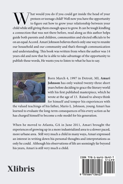 What would you do if you could get inside the head of your preteen or teenage child? Well now you have the opportunity to figure out how to grow your relationship between your child while still giving them enough space to grow. It can be tough kindling a connection that was not there before, read along as this author helps guide both parents and children, communities and elected officials to be on an equal Accord. Amari Johnson believes there's only one way to reunite our household and our community and that's through communication and understanding. This book was written from when the author was 14 years old and now that he is able to take advantage of the opportunity to publish these words, He wants you to listen to what he has to say.