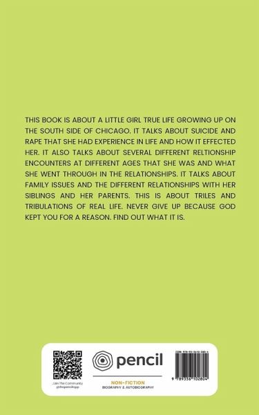 THIS BOOK IS ABOUT A LITTLE GIRL TRUE LIFE GROWING UP ON THE SOUTH SIDE OF CHICAGO. IT TALKS ABOUT SUICIDE AND RAPE THAT SHE HAD EXPERIENCE IN LIFE AND HOW IT EFFECTED HER. IT ALSO TALKS ABOUT SEVERAL DIFFERENT RELTIONSHIP ENCOUNTERS AT DIFFERENT AGES THAT SHE WAS AND WHAT SHE WENT THROUGH IN THE RELATIONSHIPS. IT TALKS ABOUT FAMILY ISSUES AND THE DIFFERENT RELATIONSHIPS WITH HER SIBLINGS AND HER PARENTS. THIS IS ABOUT TRILES AND TRIBULATIONS OF REAL LIFE. NEVER GIVE UP BECAUSE GOD KEPT YOU FOR A REASON. FIND OUT WHAT IT IS.