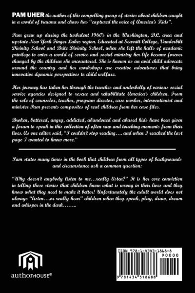 "Ms. U....Ms.U..." the voice called out in a loud little roar! "They don't listen to me. Never, ever does any of them listen. Why Ms. U? Why don't they listen? This book is a compliation of stories about American Children in Crisis. They are compelling glimpses from each child's view of their lives, in their own words. You will not be able to put this book down! It will touch your soul....pierce your heart... and leave you asking what can I do about these kids? The children are composites of many children whom the author worked with across America. The stories are moments captured where the children talk from their spirit, mind and heart about their lives to a person they call Ms. U or sometimes Ms Pam. A person they trusted with their stories and their lives! The book calls us to examine our social service system. Is it really helping children...is it really meeting their needs? Ms. Uher lets the children and their stories reveal the answer. She does ask many questions about the antiquated child welfare system in America, while presenting a new model for communities to embrace: "Guardian Families". Every social worker,childcare provider,teacher,therapist,case manager,minister,parent,mother, father,grandparent must read this book. TAKE IT HOME TODAY...GIVE IT AS A GIFT...YOU WILL NEVER FORGET THE CHILDREN AND THEIR STORIES...let your heart be touched and your spirit motivated. "LISTEN TO ME: Whispers in the Dark" .....lessons taught to me by children A New Book by Author -- Pam Uher