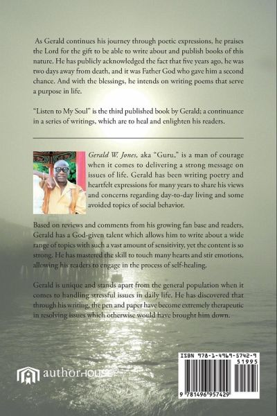 As Gerald continues his journey through poetic expressions, he praises the Lord for the gift to be able to write about and publish books of this nature. He has publicly acknowledged the fact that five years ago, he was two days away from death, and it was Father God who gave him a second chance. And with the blessings, he intends on writing poems that serve a purpose in life. "Listen to My Soul" is the third published book by Gerald; a continuance in a series of writings, which are to heal and enlighten his readers.