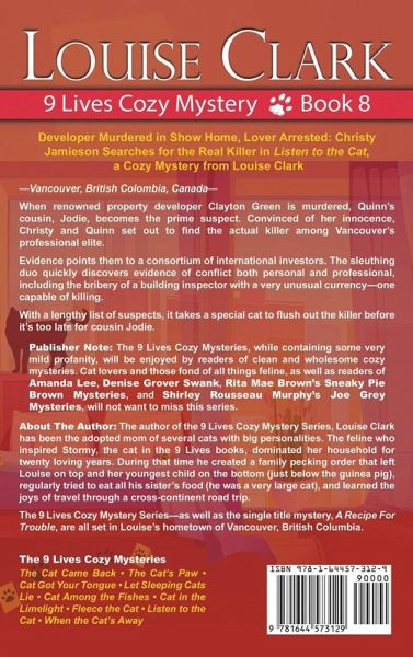 Developer Murdered In Show Home, Lover Arrested: Christy Jamieson Searches for the Real Killer in Listen to the Cat, a Cozy Mystery from Louise Clark. --Vancouver, British Colombia, Canada- When renowned property developer Clayton Green is murdered, Quinn's cousin, Jodie, becomes the prime suspect. Convinced of her innocence, Christy and Quinn set out to find the actual killer among Vancouver's professional elite. Evidence points them to a consortium of international investors. The sleuthing duo quickly discovers evidence of conflict both personal and professional, including the bribery of a building inspector with a very unusual currency-one capable of killing. With a lengthy list of suspects, it takes a special cat to flush out the killer before it's too late for cousin Jodie. Publisher Note: The 9 Lives Cozy Mysteries, while containing some very mild profanity, will be enjoyed by readers of clean and wholesome cozy mysteries. Cat lovers and those fond of all things feline, as well as readers of Amanda Lee, Denise Grover Swank, Rita Mae Brown's Sneaky Pie Brown Mysteries, and Shirley Rousseau Murphy's Joe Grey Mysteries, will not want to miss this series.