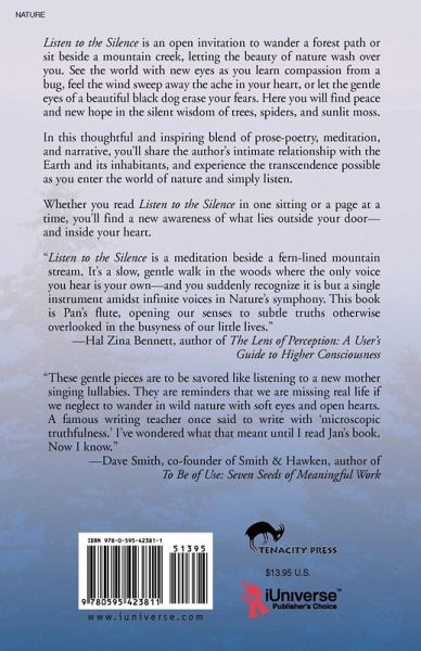 Listen to the Silence is an open invitation to wander a forest path or sit beside a mountain creek, letting the beauty of nature wash over you. See the world with new eyes as you learn compassion from a bug, feel the wind sweep away the ache in your heart, or let the gentle eyes of a beautiful black dog erase your fears. Here you will find peace and new hope in the silent wisdom of trees, spiders, and sunlit moss. In this thoughtful and inspiring blend of prose-poetry, meditation, and narrative, you'll share the author's intimate relationship with the Earth and its inhabitants, and experience the transcendence possible as you enter the world of nature and simply listen. Whether you read Listen to the Silence in one sitting or a page at a time, you'll find a new awareness of what lies outside your door-and inside your heart. "Listen to the Silence is a meditation beside a fern-lined mountain stream. It's a slow, gentle walk in the woods where the only voice you hear is your own-and you suddenly recognize it is but a single instrument amidst infinite voices in Nature's symphony. This book is Pan's flute, opening our senses to subtle truths otherwise overlooked in the busyness of our little lives." ~ Hal Zina Bennett, author of The Lens of Perception: A User's Guide to Higher Consciousness "These gentle pieces are to be savored like listening to a new mother singing lullabies. They are reminders that we are missing real life if we neglect to wander in wild nature with soft eyes and open hearts. A famous writing teacher once said to write with 'microscopic truthfulness.' I've wondered what that meant until I read Jan's book. Now I know." ~ Dave Smith, co-founder of Smith & Hawken, author of To Be of Use: Seven Seeds of Meaningful Work