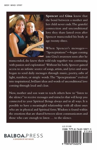 Emotions are the language of Spirit. When emotions are felt, throughout your entire being, they're received as messages and miracles. Learning to tune in to feelings is key to connecting to gratitude and unconditional love. Spencer and Gina know that the bond between a mother and her child never ends. The grateful connection and unconditional love they share lasted even after Spencer transcended his body at age twenty-three. When Spencer's messages-"Spencpirations"-began coming into Gina's awareness soon after he transcended, she knew their wild ride together was continuing with passion and exploration! Without his body, Spencer gained access to an infinite source of songs, artists, and lyrics and soon began to send daily messages through music, poetry, orbs of light, numbers, or simple words. The "Spencpirations" evolved into inspirational, brilliant ideas and words of unconditional love coming through loud and clear. Now, mother and son want to teach others how to "listen to the silence" to receive messages and miracles that will keep you connected to your Spiritual Beings always and in all ways. It is possible to have a meaningful relationship with all silent ones who are in physical and Spiritual form. Wisdom is found within the emotions that are shared between silent communicators and those who care enough to listen ... to the silence.