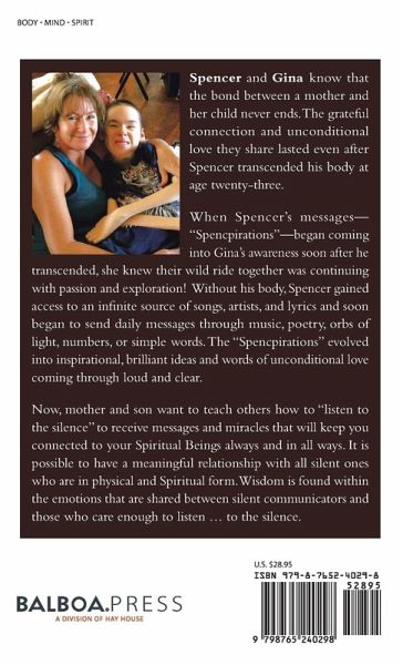 Emotions are the language of Spirit. When emotions are felt, throughout your entire being, they're received as messages and miracles. Learning to tune in to feelings is key to connecting to gratitude and unconditional love. Spencer and Gina know that the bond between a mother and her child never ends. The grateful connection and unconditional love they share lasted even after Spencer transcended his body at age twenty-three. When Spencer's messages-"Spencpirations"-began coming into Gina's awareness soon after he transcended, she knew their wild ride together was continuing with passion and exploration! Without his body, Spencer gained access to an infinite source of songs, artists, and lyrics and soon began to send daily messages through music, poetry, orbs of light, numbers, or simple words. The "Spencpirations" evolved into inspirational, brilliant ideas and words of unconditional love coming through loud and clear. Now, mother and son want to teach others how to "listen to the silence" to receive messages and miracles that will keep you connected to your Spiritual Beings always and in all ways. It is possible to have a meaningful relationship with all silent ones who are in physical and Spiritual form. Wisdom is found within the emotions that are shared between silent communicators and those who care enough to listen ... to the silence.