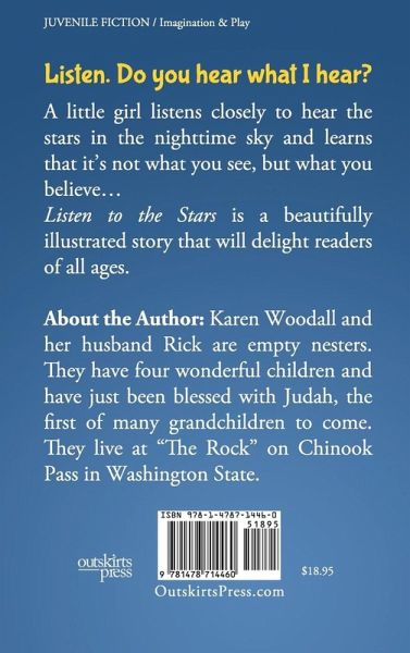 Listen to the Stars is the first of many colorful children's books about Kkay, also known as Karen. This book is an adventure in a six year olds logic and reasoning. Kkay believes she can hear the stars and doesn't understand why no one else does. Just ask Kkay, if you listen closely you can hear them moving. KKay would say "I'm this many", holding up her left hand and pointing finger. Yes she can count and knows exactly how many that is. Kkay knows everything because she is six years old. She's not always right but knows what she believes. In Hawaii, Kkay lives with her Mother, Father, brothers Victor and Ralph. Her Father is a Chief Petty Officer in the Navy and is gone a lot. Her Mother takes care of her and her brothers. She is the middle child. At this time in her life her youngest brother Jacob hasn't been born yet. Kkay doesn't miss much she knows exactly where babies come from; they picked her brother Ralph up at the hospital. Future books include stories are about her Mother's bedtime magical powers and that Santa Clause likes buttermilk. Yes, she believes in Santa because he comes to her house. Kkay's house doesn't have a chimney but her Mother made a fireplace out of brick paper and a bookcase. Kkay knows that Santa doesn't need a real chimney besides in Hawaii and no one needs a fireplace. Kkay believes she has the answer to many of life's mysteries. She doesn't realize they are not necessarily the right answers. There is peace in knowing what you know, if only life remained uncomplicated.