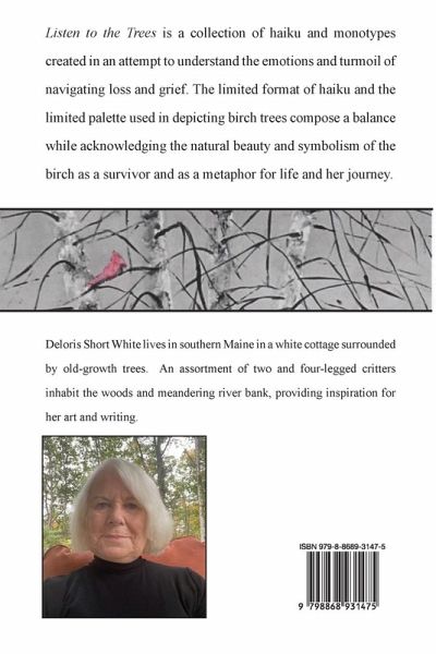 Listen to the Trees is a collection of haiku and monotypes created in her attempt to understand the emotions and turmoil of navigating loss and grief. The limited format of haiku and the limited palette used in depicting birch trees compose a balance while acknowledging the natural beauty and symbolism of the birch as a survivor and as a metaphor for life and her journey.