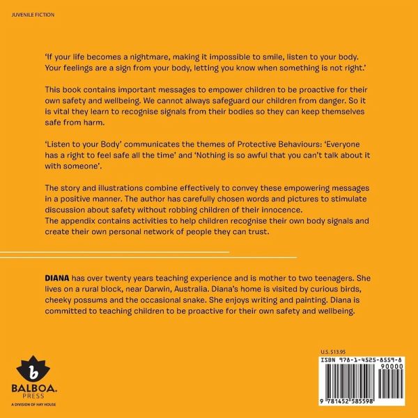 'If your life becomes a nightmare, making it impossible to smile, listen to your body. Your feelings are a sign from your body, letting you know when something is not right.' This book contains important messages to empower children to be proactive for their own safety and wellbeing. We cannot always safeguard our children from danger. So it is vital they learn to recognize signals from their bodies so they can keep themselves safe from harm. 'Listen to your Body' communicates the themes of Protective Behaviours: 'Everyone has a right to feel safe all the time' and 'Nothing is so awful that you can't talk about it with someone'. The story and illustrations combine effectively to convey these empowering messages in a positive manner. The author has carefully chosen words and pictures to stimulate discussion about safety without robbing children of their innocence. The appendix contains activities to help children recognize their own body signals and create their own personal network of people they can trust.