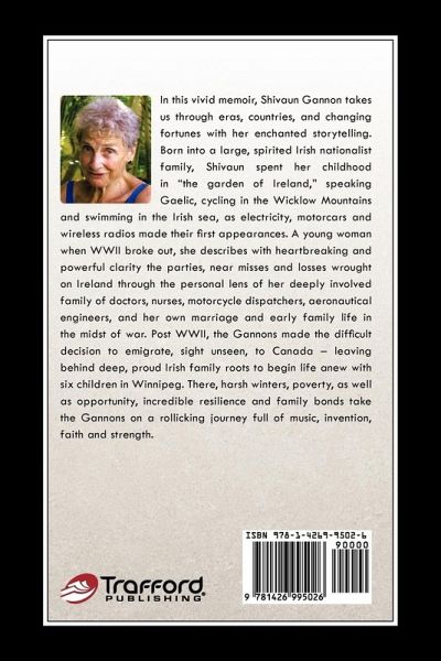 In this vivid account of nearly 100 years of passionate life, Shivaun Gannon takes us through eras, countries, and changing fortunes with her enchanted storytelling. Born into a large, spirited Irish nationalist family, Shivaun spent her childhood in "the garden of Ireland," speaking Gaelic, cycling in the Wicklow Mountains and swimming in the Irish sea, as electricity, motorcars and wireless radios made their first appearances. A young woman when WWII broke out, she describes with heartbreaking and powerful clarity the parties, near misses and losses wrought on Ireland through the personal lens of her deeply involved family of doctors, nurses, motorcycle dispatchers, aeronautical engineers, and her own marriage and early family life in the midst of war. Post WWII, the Gannons made the difficult decision to emigrate, sight unseen, to Canada - leaving behind deep, proud Irish family roots to begin life anew with six children in Winnipeg. There, harsh winters, poverty, as well as opportunity, incredible resilience and family bonds take the Gannons on a rollicking journey full of music, invention, faith and strength.