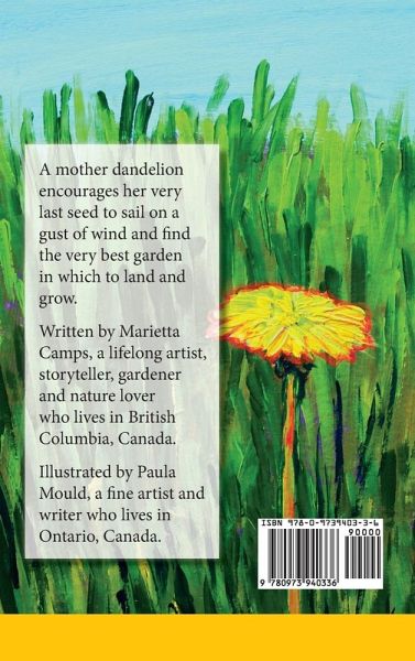 A mother dandelion encourages her very last seed to sail on a gust of wind and find the very best garden in which to land and grow. Written by Marietta Camps, a lifelong artist, storyteller, gardener and nature lover who lives in British Columbia, Canada. Illustrated by Paula Mould, a fine artist, and writer who lives in Ontario, Canada. Beautifully rendered, this imaginative tale is inspiring, entertaining and educational. It is the first book in the ‘I believe in you’ series inspired by the author’s grandson, a teacher. This book is hardcover, full colour and designed for all readers. Large font on coloured background with drop capital letters starting each page provide maximum legibility.