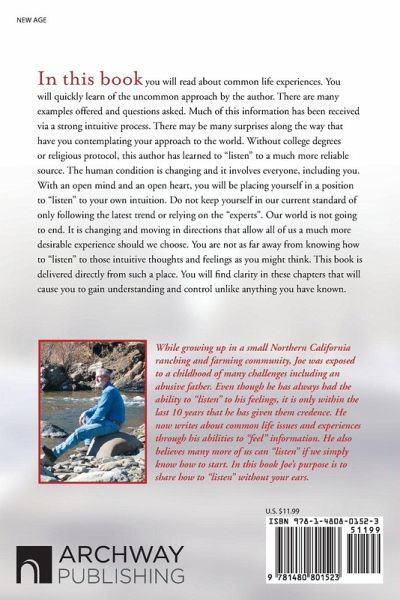 In this book you will read about common life experiences. You will quickly learn of the uncommon approach by the author. There are many examples offered and questions asked. Much of this information has been received via a strong intuitive process. There may be many surprises along the way that have you contemplating your approach to the world. Without college degrees or religious protocol, this author has learned to "listen" to a much more reliable source. The human condition is changing and it involves everyone, including you. With an open mind and an open heart, you will be placing yourself in a position to "listen" to your own intuition. Do not keep yourself in our current standard of only following the latest trend or relying on the "experts". Our world is not going to end. It is changing and moving in directions that allow all of us a much more desirable experience should we choose. You are not as far away from knowing how to "listen" to those intuitive thoughts and feelings as you might think. This book is delivered directly from such a place. You will find clarity in these chapters that will cause you to gain understanding and control unlike anything you have known.