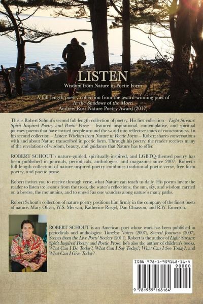 A full-length poetry collection from the award-winning poet of In the Shadows of the MornAndrew Ross Nature Poetry Award (2017) This is Robert Schout's second full-length collection of poetry. His first collection - Light Stream: Spirit Inspired Poetry and Poetic Prose - featured inspirational, contemplative, and spiritual journey poems that have invited people around the world into reflective states of consciousness. In his second collection - Listen: Wisdom from Nature in Poetic Form - Robert shares conversations with and about Nature transcribed in poetic form. Through his poetry, the reader receives many of the revelations of wisdom, beauty, and guidance that Nature has to offer. ROBERT SCHOUT 's nature-guided, spiritually-inspired, and LGBTQ-themed poetry has been published in journals, periodicals, anthologies, and magazines since 2007. Robert's full-length collection of nature-inspired poetry combines traditional poetic verse, free-form poetry, and poetic prose. Robert invites you to receive through verse, what Nature can teach us daily. His poems invite the reader to listen to: lessons from the trees, the water's reflections, the sun, sky, and wisdom carried on a breeze, the mountains, and to oneself as one wanders along nature's many paths. Robert Schout's collection of nature poetry positions him firmly in the company of the finest poets of nature: Mary Oliver, W.S. Merwin, Katherine Riegel, Dan Chiasson, and R.W. Emerson. ROBERT SCHOUT is an American poet whose work has been published in periodicals and anthologies: Timeless Voices(2007), Sacred Journeys (2007), Scenes from the Live Poets' Society (2011). Robert Schout is an author of children's books, What Can I Do Today?, What Can I Say Today?, What Can I See Today?, and What Can I Give Today?