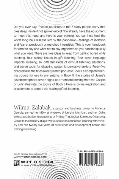 Did you ever say, ""Please just listen to me""? Many people carry that plea deep inside if not spoken aloud. You already have the equipment to meet this need, and here is your training. You can help heal the worst long-haul disease left by the pandemic--feelings of isolation and fear at previously unmatched intensities. This is your handbook for what to say and what not to say, organized so you can find quickly what you want. There are nine ideas to keep from getting bored while listening, four safety issues in gift listening, four ways language impacts listening, six different kinds of difficult listening situations, and seven tools for disabling systemic pervasive anxiety. Forty-five chapters like the titles already listed populate Book I, a complete training course for use in any setting. In Book II, the stories of Jesus's seven metaphors, seven signs, and more on listening from the Gospel of John illustrate the topics of Book I. Here is divine inspiration and enablement to spread the healing gift of listening.