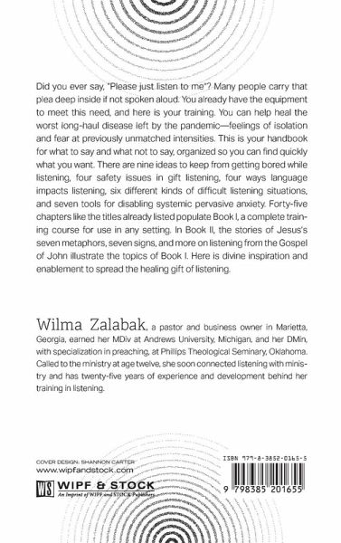 Did you ever say, ""Please just listen to me""? Many people carry that plea deep inside if not spoken aloud. You already have the equipment to meet this need, and here is your training. You can help heal the worst long-haul disease left by the pandemic--feelings of isolation and fear at previously unmatched intensities. This is your handbook for what to say and what not to say, organized so you can find quickly what you want. There are nine ideas to keep from getting bored while listening, four safety issues in gift listening, four ways language impacts listening, six different kinds of difficult listening situations, and seven tools for disabling systemic pervasive anxiety. Forty-five chapters like the titles already listed populate Book I, a complete training course for use in any setting. In Book II, the stories of Jesus's seven metaphors, seven signs, and more on listening from the Gospel of John illustrate the topics of Book I. Here is divine inspiration and enablement to spread the healing gift of listening.