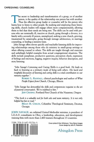 The secret to leadership and transformation of a group, or of another person, is the quality of the relationship one person has with another. Thus the effective group leader or counselor will be the person who learns how to listen to other people. By studying and employing these listening skills, church leaders will engage others more compassionately, allowing them to feel that their needs are being met. The skills can be used with persons who are terminally ill, inactive at church, going through a divorce, in a family with a severely ill person, unemployed, seeking a new church, grieving, traumatized by catastrope, going through teenage adolescence, in marriage counseling, or leading a ministry team. John Savage offers eleven specific and teachable listening skills for improving relationships among those who do ministry in small-group settings or when offering counsel to others. The skills are taught through oral exercises and unfailingly helpful examples from actual congregational situations. The skills include paraphrase, productive questions, perception check, expression of feelings and emotions, fogging, negative inquiry, behavior description, and story listening.
