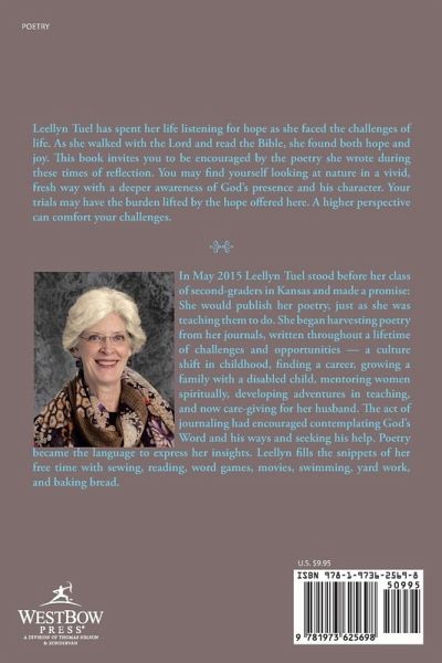Leellyn Tuel has spent her life listening for hope as she faced the challenges of life. As she walked with the Lord and read the Bible, she found both hope and joy. This book invites you to be encouraged by the poetry she wrote during these times of reflection. You may find yourself looking at nature in a vivid, fresh way with a deeper awareness of Gods presence and his character. Your trials may have the burden lifted by the hope offered here. A higher perspective can comfort your challenges.