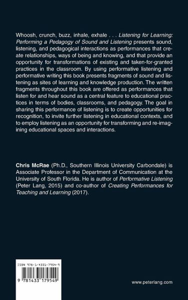 "Spending over two decades listening to and learning from scholars who approach the world of human communication in distinct ways is one of the many blessings of my academic life. Among the most instructive have been performance scholars who merge the interpretive turn and a critical reflexivity with uncommon flair and grace. With Listening for Learning, I am reminded of the ways of teaching, of learning, and of listening that I struggled to understand as a newly minted Assistant Professor. My performance colleagues engaged in scholarly and pedagogical practices that took seriously the embodied nature of experience, something that I knew at an intellectual level but had never fully grasped phenomenologically. McRae eloquently weaves together research and his own classroom practices with sustained attention to the role of sound and soundscapes, the situatedness of listening, and the possibilities enabled when we attune to others. The book is an excellent deep dive into how we might approach learning (either as teachers or students) in a manner that takes listening seriously. It puts the generative nature of listening, communication, and performance front-and-center, providing a truly novel contribution to the field."-Graham Bodie, Professor of Integrated Marketing Communication, The University of Mississippi