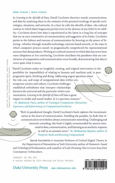 In Listening in the Afterlife of Data, David Cecchetto theorizes sound, communication, and data by analyzing them in the contexts of the practical workings of specific technologies, situations, and artworks. In a time he calls the afterlife of data-the cultural context in which data's hegemony persists even in the absence of any belief in its validity-Cecchetto shows how data is repositioned as the latest in a long line of concepts that are at once constitutive of communication and suggestive of its limits. Cecchetto points to the failures and excesses of communication by focusing on the power of listening-whether through wearable technology, internet-based artwork, or the ways in which computers process sound-to pragmatically comprehend the representational excesses that data produces. Writing at a cultural moment in which data has never been more ubiquitous or less convincing, Cecchetto elucidates the paradoxes that are constitutive of computation and communication more broadly, demonstrating that data is never quite what it seems.