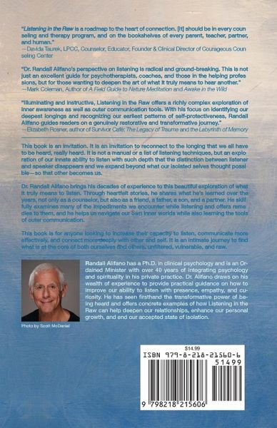 This book is an invitation. It is an invitation to reconnect to the longing that we all have to be heard, really heard. It is not a manual or a list of listening techniques, but an exploration of our innate ability to listen with such depth that the distinction between listener and speaker disappears and we expand beyond what our isolated selves thought possible-so that other becomes us. Dr. Randall Alifano brings his decades of experience to this beautiful exploration of what it truly means to listen. Through heartfelt stories, he shares what he's learned over the years, not only as a counselor, but also as a friend, a father, a son, and a partner. He skillfully examines many of the impediments we encounter while listening and offers remedies to them, and he helps us navigate our own inner worlds while also learning the tools of outer communication. In this book, Dr. Alifano explores how to:Listen from a place of curiosity and love Examine your filters so they don't get in the way of listening Empty yourself of intentions when listening Listen to what is underneath what's being spoken Tap back into your innocence and reignite your curiosity Deeply empathize with another while listening Expand your sense of self through connection with another This book is for anyone looking to increase their capacity to listen, communicate more effectively, and connect more deeply with other and self. It is an intimate journey to find what is at the core of both ourselves and others, unfiltered, vulnerable, and raw. We are all aching to be heard. We are all aching to connect. Our first step is to learn to Listen in the Raw.