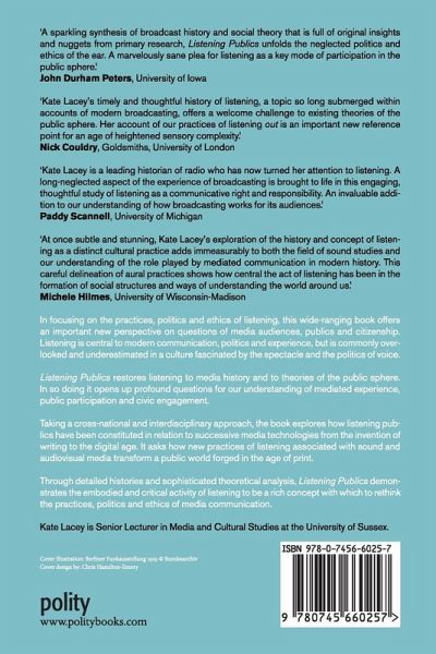 "At once subtle and stunning, Kate Lacey's exploration of the history and concept of listening as a distinct cultural practice adds immeasurably to both the field of sound studies and our understanding of the role played by mediated communication in modern history. This careful delineation of aural practices shows how central the act of listening has been in the formation of social structures and ways of understanding the world around us."
