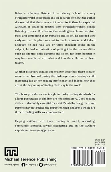Being a volunteer listener in a primary school is a very straightforward description and an accurate one, but the author insight discovered that there was a lot more to it than he expected. Although it could be treated very straightforwardly, simply listening to one child after another reading from his or her given book and correcting their mistakes and so on, he decided very early on that his place was not to teach or assess. And indeed although he had read two or three excellent books on the subject, he had no intention of getting into the technicalities such as phonics, split digraphs and so on, not least because it may have conflicted with what and how the children had been taught. Another discovery that, as one chapter describes, there is much more to be observed during the bird's eye view of seeing a child increasing his or her reading proficiency and indeed how they are at the beginning of finding their way in the world. This book provides a clear insight into why reading standards for a large percentage of children are not satisfactory. Good reading skills are absolutely essential for a child's intellectual growth and parents may not realise the impact on their children's whole life if their reading skills are compromised. Helping children with their reading is useful, rewarding, sometimes amusing, always fascinating and in the author's experience an ongoing pleasure.