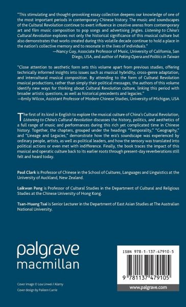 Introduction; Paul Clark, Laikwan Pang and Tsan-Huang Tsai PART I: TEMPORALITY: CONTINUITY AND CHANGE IN CULTURAL REVOLUTION MUSIC 1. A Diachronic Study of Jingju Yangbanxi Model Peking Opera Music; Dai Jiafang, translated by Lau Sze Wing 2. From Confucianist Meditative Tool to Maoist Revolutionary Weapon: The Seven-Stringed Zither (Qin) in the Cultural Revolution; Tsan-Huang Tsai 3. Breaking Bad: Sabotaging the Production of the Hero in the Amateur Performance of Yangbanxi; Laurence Coderre 4. Third World Internationalism: Films and Operas in the Chinese Cultural Revolution; Ban Wang 5. Singing in the Dark: Film and Cultural Revolution Musical Culture; Paul Clark PART II: GEOGRAPHY: TRANSPLANTATION AND THE MAKING OF REGIONAL YANGBANXI 6. Dialects as Untamable: How to Revolutionize Cantonese Opera?; Laikwan Pang 7. The West is Red: Uyghur Adaptation of The Legend of the Red Lantern (Qizil Chiragh) During China ' 's Cultural Revolution; Chuen-Fung Wong 8. The Dragon River Reaches the Borders: The Rehabilitation of Ethnic Music in a Model Opera; Rowan Pease PART III: LEGACIES AND LINEAGES: CULTURAL REVOLUTION SOUNDSCAPES BEYOND THE MAO ERA 9. Musical-Dramatic Experimentation in the Yangbanxi: A Case for Precedence in The Great Wall; John Winzenburg 10. Sonic Imaginary After the Cultural Revolution; Nancy Yunhwa Rao 11. Just Beat It! Popular Legacies of Cultural Revolution Music; Barbara Mittler