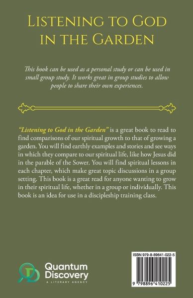 This book can be used as a personal study or can be used in small group study. It works great in group studies to allow people to share their own experiences. "Listening to God in the Garden" is a great book to read to find comparisons of our spiritual growth to that of growing a garden. You will find earthly examples and stories and see ways in which they compare to our spiritual life, like how Jesus did in the parable of the Sower. You will find spiritual lessons in each chapter, which make great topic discussions in a group setting. This book is a great read for anyone wanting to grow in their spiritual life, whether in a group or individually. This book is an idea for use in a discipleship training class.