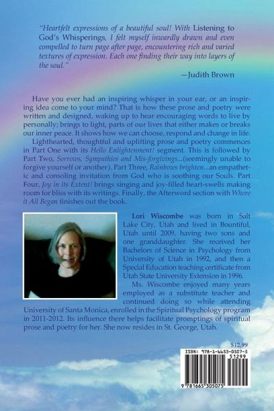 Have you ever had an inspiring whisper in your ear, or an inspiring idea come to your mind? That is how these prose and poetry were written and designed, waking up to hear encouraging words to live by personally; brings to light, parts of our lives that either makes or breaks our inner peace. It shows how we can choose, respond and change in life. Lighthearted, thoughtful and uplifting prose and poetry commences in Part One with its Hello Enlightenment! segment. This is followed by Part Two, Sorrows, Sympathies and Mis-forgivings (seemingly unable to forgive yourself or another)... Part Three, Rainbows brighten...an empathetic and consoling invitation from God who is soothing our Souls. Part Four, Joy in its Extent! brings singing and joy-filled heart-swells making room for bliss with its writings. Finally, the Afterword section with Where it All Began finishes out the book.