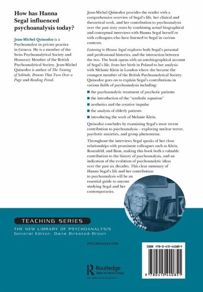 Winner of the 2010 Sigourney Award! How has Hanna Segal influenced psychoanalysis today? Jean-Michel Quinodoz provides the reader with a comprehensive overview of Segal's life, her clinical and theoretical work, and her contribution to psychoanalysis over the past sixty years by combining actual biographical and conceptual interviews with Hanna Segal herself or with colleagues who have listened to Segal in various contexts. Listening to Hanna Segal explores both Segal's personal and professional histories, and the interaction between the two. The book opens with an autobiographical account of Segal's life, from her birth in Poland to her analysis with Melanie Klein in London where she became the youngest member of the British Psychoanalytical Society. Quinodoz goes on to explain Segal's contributions in various fields of psychoanalysis including: the psychoanalytic treatment of psychotic patients the introduction of the "symbolic equation" aesthetics and the creative impulse the analysis of elderly patients introducing the work of Melanie Klein. Quinodoz concludes by examining Segal's most recent contribution to psychoanalysis - exploring nuclear terror, psychotic anxieties, and group phenomena. Throughout the interviews Segal speaks of her close relationships with prominent colleagues such as Klein, Rosenfeld, and Bion, making this book both a valuable contribution to the history of psychoanalysis and an indication of the evolution of psychoanalytic ideas over the past six decades. This clear summary of Hanna Segal's life and her contribution to psychoanalysis will be an essential guide to anyone studying Segal and her contemporaries.