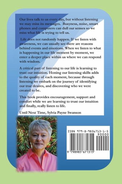 Our lives talk to us every day, but without listening we may miss its messages. Busyness, noise, smart phones and computers can dull our senses, so we miss what life is trying to tell us. This book is a collection of inspiring quotes, words of wisdom, and thoughts for daily living. The author uses her own life's experiences as well. It is designed to help you find inner peace, clarity and direction in your life. Life does not randomly happen. If we listen with awareness, we can usually see there are reasons behind events and emotions. When we listen to what is happening in our life moment by moment, we enter a deeper place within us where we can respond with wisdom. A critical part of listening to our life is learning to trust our intuition. Honing our listening skills adds to the quality of each moment, because through listening we embark on the journey of identifying our true desires, and discovering who we were created to be. The book is divided into several categories, including love, happiness, success and wisdom. Whether you are looking for inspiration to overcome a challenge, or simply want to deepen your understanding of life, this book will provide you with valuable insights and wisdom. This book provides encouragement, support and comfort while we are learning to trust our intuition and finally, really listen to life.