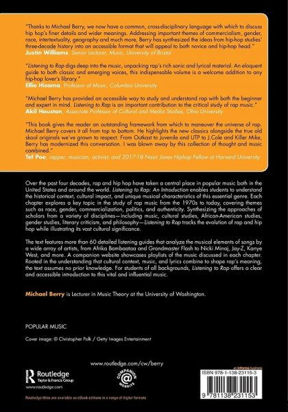 Over the past four decades, rap and hip hop culture have taken a central place in popular music both in the United States and around the world. Listening to Rap: An Introduction enables students to understand the historical context, cultural impact, and unique musical characteristics of this essential genre. Each chapter explores a key topic in the study of rap music from the 1970s to today, covering themes such as race, gender, commercialization, politics, and authenticity. Synthesizing the approaches of scholars from a variety of disciplines-including music, cultural studies, African-American studies, gender studies, literary criticism, and philosophy-Listening to Rap tracks the evolution of rap and hip hop while illustrating its vast cultural significance.