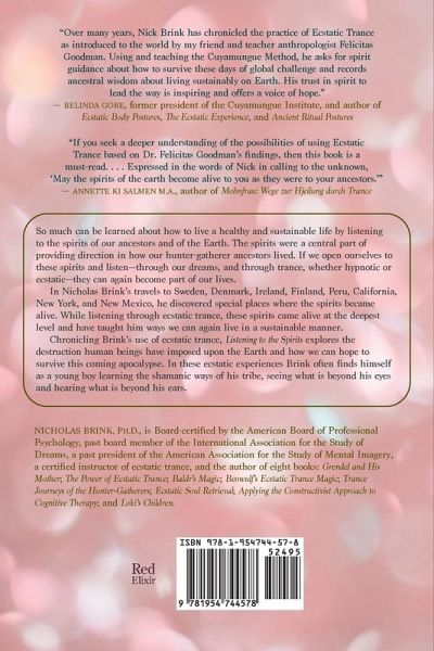 So much can be learned about how to live a healthy and sustainable life by listening to the spirits of our ancestors and of the Earth. The spirits were a central part of providing direction in how our hunter-gatherer ancestors lived. If we open ourselves to these spirits and listen-through our dreams, and through trance, whether hypnotic or ecstatic-they can again become part of our lives. In Nicholas Brink's travels to Sweden, Denmark, Ireland, Finland, Peru, California, New York, and New Mexico, he discovered special places where the spirits became alive. While listening through ecstatic trance, these spirits come alive at the deepest level, and have taught him ways we can again live in a sustainable manner. Chronicling Brink's use of ecstatic trance Listening to the Spirits explores the destruction human beings have imposed upon the Earth and how we can hope to survive this coming apocalypse. In these ecstatic experiences Brink often finds himself as a young boy learning the shamanic ways of his tribe, seeing what is beyond his eyes and hearing what is beyond his ears.