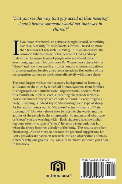 "Did you see the way that guy acted at that meeting? I can't believe someone would act that way in church!" If you have ever heard, or perhaps thought or said, something like this, Listening To Your Sheep is for you. Based on more than ten years of research, Listening To Your Sheep uses the common Biblical image of the people of God as "sheep" to describe the major types of people who are bound to be in every congregation. Not only does Dr. Wayne Perry describe the "sheep" and how they are likely to respond in common situations in a congregation, he also gives concrete advice the leaders of the congregation can use to work more effectively with these sheep. The book begins with some necessary background on listening skills and on the rules by which all human systems, from families to congregations to multinational organizations, operate. With this foundation in place, each succeeding chapters describes a particular kind of "sheep" which will be found in every religious body. Listening is indeed key to "diagnosing" each type of sheep. As the author points out, to "diagnose" actually means to "listen thoroughly." Dr. Perry shows how to listen to the words and the actions of the people in the congregation to understand what type of "sheep" you are working with. Each chapter also shows what happens when this type of "sheep" become a shepherd, that is, when the sheep becomes a leader of the body. The results are often fascinating. All the more so because the practical suggestions Dr. Perry provides are based on research into and observations of many different religious groups. You are sure to "hear" someone you know in this book.