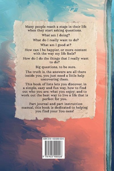 Most people will reach a stage in their life when they start asking questions. What am I doing? What do I really want to do? What am I good at? How can I feel happier, or more content with the way my life feels? How do I do the things that I really want to do? Big questions, to be sure. The truth is, the answers are all there inside you, you just need a little help uncovering that information. This book of lists lets you discover, in a simple, easy and fun way, how to find out who you are; what you enjoy; and to work out the best way to live a life that is perfect for you. Part journal and part instruction manual, this book is dedicated to helping you find your You-ness!