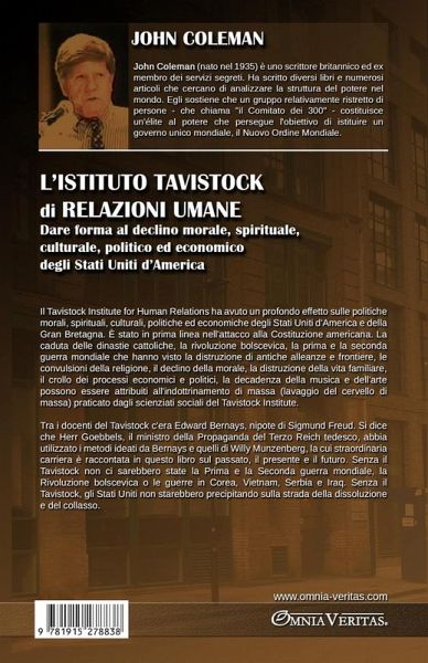 Il Tavistock Institute for Human Relations ha avuto un profondo effetto sulle politiche morali, spirituali, culturali, politiche ed economiche degli Stati Uniti d'America e della Gran Bretagna. È stato in prima linea nell'attacco alla Costituzione americana. La caduta delle dinastie cattoliche, la rivoluzione bolscevica, la prima e la seconda guerra mondiale che hanno visto la distruzione di antiche alleanze e frontiere, le convulsioni della religione, il declino della morale, la distruzione della vita familiare, il crollo dei processi economici e politici, la decadenza della musica e dell'arte possono essere attribuiti all'indottrinamento di massa (lavaggio del cervello di massa) praticato dagli scienziati sociali del Tavistock Institute. Tra i docenti del Tavistock c'era Edward Bernays, nipote di Sigmund Freud. Si dice che Herr Goebbels, il ministro della Propaganda del Terzo Reich tedesco, abbia utilizzato i metodi ideati da Bernays e quelli di Willy Munzenberg, la cui straordinaria carriera è raccontata in questo libro sul passato, il presente e il futuro. Senza il Tavistock non ci sarebbero state la Prima e la Seconda guerra mondiale, la Rivoluzione bolscevica o le guerre in Corea, Vietnam, Serbia e Iraq. Senza il Tavistock, gli Stati Uniti non starebbero precipitando sulla strada della dissoluzione e del collasso.