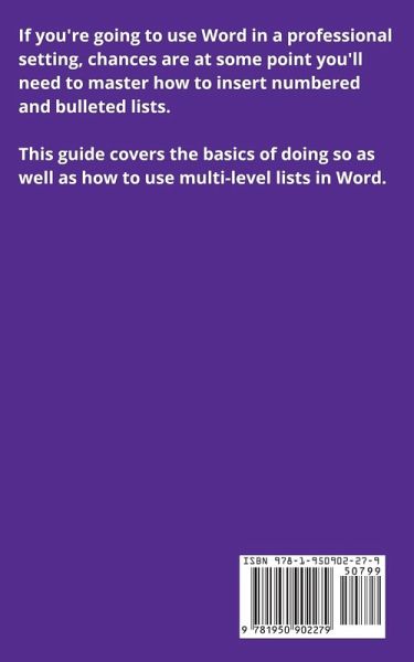 If you're going to use Word in a professional setting, chances are at some point you'll need to master how to insert numbered and bulleted lists. This guide covers the basis of doing so as well as how to use multi-level lists in Word. The Easy Word Essentials series of titles are meant to cover one specific topic of interest to users who know the basics of how to navigate Word and are drawn from the Word Essentials series which consists of Word for Beginners and Intermediate Word.