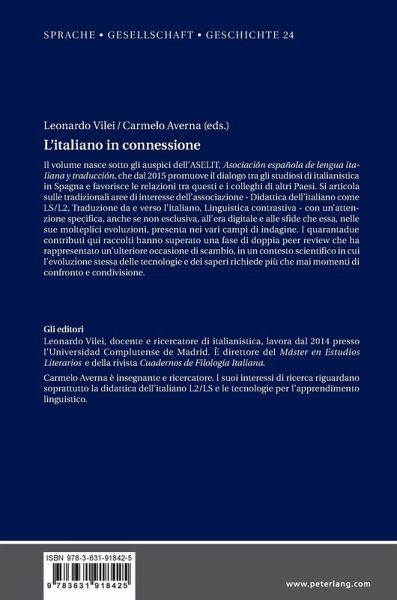 Il volume nasce sotto gli auspici dell'ASELIT, Asociación española de lengua italiana y traducción, che dal 2015 promuove il dialogo tra gli studiosi di italianistica in Spagna e favorisce le relazioni tra questi e i colleghi di altri Paesi. Si articola sulle tradizionali aree di interesse dell'associazione - Didattica dell'italiano come LS/L2, Traduzione da e verso l'italiano, Linguistica contrastiva - con un'attenzione specifica, anche se non esclusiva, all'era digitale e alle sfide che essa, nelle sue molteplici evoluzioni, presenta nei vari campi di indagine. I quarantadue contributi qui raccolti hanno superato una fase di doppia peer review che ha rappresentato un'ulteriore occasione di scambio, in un contesto scientifico in cui l'evoluzione stessa delle tecnologie e dei saperi richiede più che mai momenti di confronto e condivisione.