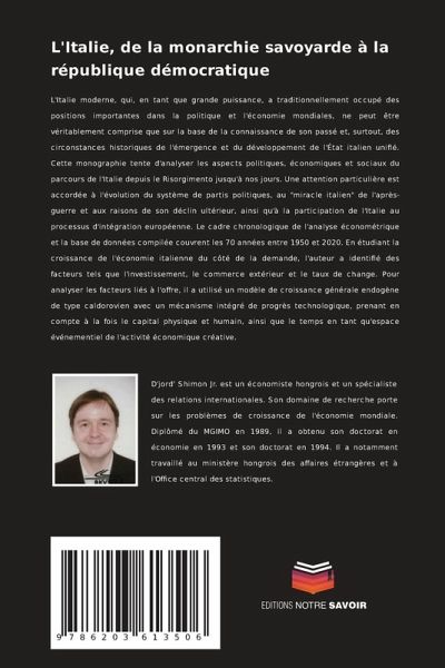 L'Italie moderne, qui, en tant que grande puissance, a traditionnellement occupé des positions importantes dans la politique et l'économie mondiales, ne peut être véritablement comprise que sur la base de la connaissance de son passé et, surtout, des circonstances historiques de l'émergence et du développement de l'État italien unifié. Cette monographie tente d'analyser les aspects politiques, économiques et sociaux du parcours de l'Italie depuis le Risorgimento jusqu'à nos jours. Une attention particulière est accordée à l'évolution du système de partis politiques, au "miracle italien" de l'après-guerre et aux raisons de son déclin ultérieur, ainsi qu'à la participation de l'Italie au processus d'intégration européenne. Le cadre chronologique de l'analyse économétrique et la base de données compilée couvrent les 70 années entre 1950 et 2020. En étudiant la croissance de l'économie italienne du côté de la demande, l'auteur a identifié des facteurs tels que l'investissement, le commerce extérieur et le taux de change. Pour analyser les facteurs liés à l'offre, il a utilisé un modèle de croissance générale endogène de type caldorovien avec un mécanisme intégré de progrès technologique, prenant en compte à la fois le capital physique et humain, ainsi que le temps en tant qu'espace événementiel de l'activité économique créative.
