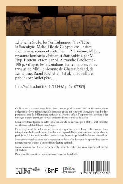 L'Italie, la Sicile, les iles eoliennes, l'ile d'Elbe, la Sardaigne, Malte, l'ile de Calypso, etc...: sites, monumens, scenes et costumes.... [V]. Venise, Milan, royaume lombards-venitien et etats voisins, par M. Hyp. Hostein, et rev. par M. Alexandre Duchesne - 108 p. / d'apres les inspirations, les recherches et les travaux de MM. le vicomte de Chateaubriand, de Lamartine, Raoul-Rochette... [et al.]; recueillis et publies par Audot pere, ...Sujet de l'ouvrage: Italie -- Descriptions et voyages -- 19e siecleComprend: Toscane; Royaume de Naples; Sicile et Malte; Rome; Venise, Milan, royaume lombards-venitien et etats voisins; Piemont, Sardaigne et SimplonCe livre est la reproduction fidele d'une oeuvre publiee avant 1920 et fait partie d'un projet propose par la Bibliotheque nationale de France (BnF), offrant l'opportunite pour les lecteurs, enseignants ou chercheurs d'acceder a des ouvrages anciens et souvent rares issus de ses fonds patrimoniaux.Les oeuvres de cette collection appartiennent au domaine public . Elles ont ete numerisees par la BnF et sont presentes sur Gallica, la bibliotheque numerique de la BnF.En entreprenant de redonner vie a ces oeuvres au travers d'une collection de livres reimprimes a la demande, nous offrons la possibilite a ces oeuvres de rencontrer un public elargi et participons a la transmission de connaissances et de savoirs difficilement accessibles par ailleurs.Sur un plan technique, nous avons cherche a concilier la reproduction fidele d'un livre ancien a partir de sa version numerisee avec le souci d'un confort de lecture optimal. Nous esperons que les ouvrages de cette nouvelle collection vous apporteront entiere satisfaction.http: //gallica.bnf.fr/ark: /12148/bpt6k107583j