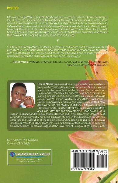 Litany of a Foreign Wife, Nnane Ntube's beautifully crafted debut collection of poetry projects images of a society marked by instability, feelings of homelessness, disorientation, oppression and neglect. Through her storytelling style of poetry, she interrogates humanity's existence in a context where life's meanings are gradually fading and absurdities are becoming the order of the day. The poems are adorned with the faculties of sight, smell, hearing, taste and touch which trigger fear, insecurity, frustration, complaints and escape, thus provoking the longing for hope, home, love and peace.