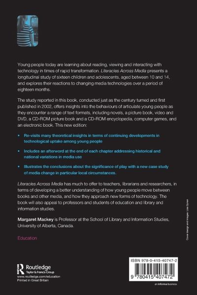 The contemporary young reader learns from a very early age to read and interpret through a broad range of media. Literacies Across Media explores how a group of boys and girls, aged from ten to fourteen, make sense of narratives in a variety of formats, including print, electronic book, video, DVD, computer game and CD-ROM. This book records these young people over a period of eighteen months as they read, view and play different texts, demonstrating variations and consistencies of interpretative behaviour across different media. Margaret Mackey analyses how the activities of reading, viewing and playing intertwine and affect each other's development. Her in-depth research shows young readers developing strategies for interpreting narratives through encounters with a diverse range of texts and media. The study breaks new ground in its illustration and exploration of the impact of cross-media fertilisation on how young readers come to an understanding of how to make sense of stories. Literacies Across Media offers both a vivid account of a group of young readers coming to terms with texts and a radical perspective on the growth of a generation of young readers. It is thought-provoking, fascinating and highly informative reading not only for theoreticians interested in the reading process, but also teachers, librarians, parents and anybody involved with young people and their texts.