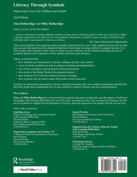 This second edition of an important and essentially practical book is now fully updated and revised to take into account the significant developments that have been made in using symbols to support literacy. It is full of ideas and examples of the ways in which access to literacy can be enhanced through the use of symbols, based on the experience of the authors and many practitioners. Topics covered include how symbols are being used in schools, colleges and day care centers; ways in which symbols can help to enhance learning and independence; lots of new examples of good practice from practitioners; the results of the Rebus Symbol development project; how symbols fit in with the National Literacy Strategy; and how symbols can be used to make information more accessible. Teachers in mainstream and special schools, teaching assistants, day-care workers and parents should find this book helps them understand how to use symbols to improve literacy and aid communication.